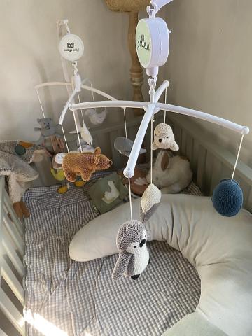 2 mobiles musicaux achetés en seconde main. Un pour le parc et l’autre pour être fixé plus tard sur le lit cage de Lucien.