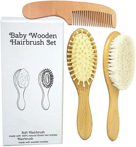 Molylove 3 pièce brosse à cheveux de bébé en bois et ensemble peigne | poils de chèvre naturel brosse | brosse à poils de bois pour nouveau-nés, bébés, tout-petits et jeunes enfants.