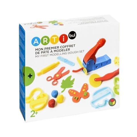 La pâte à modeler pour les plus petits, c'est par ici ! Ce coffret contient le nécessaire pour que sa première rencontre avec la pâte à modeler soit couronnée de succès ! Avec quatre petits pots de pâte à modeler et huit emporte-pièces, votre enfant moule facilement une voiture, une feuille, un avion et des animaux. Les accessoires tels qu'une presse, un rouleau à pizza, un ciseau lui permettent d'affiner ses gestes au service de créations toujours plus personnalisées. Le petit plus ? La pâte à modeler est miscible donc les mélanges les plus improbables sont autorisés et même fortement recommandés !