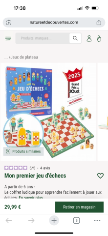 Ce produit est extrait d'une liste de cadeaux (Anniversaire, Noël, ...) déposée sur Kadolog. Kadolog permet de créer des listes de cadeaux (Anniversaire, Noël, ...) en toute liberté. Il est possible d'ajouter toutes vos envies cadeaux et de recevoir les dons directement sur votre compte. Avec les dons reçus, vous êtes alors libre d'aller acheter vos produits (comme ce 'Mon premier jeu d'échecs pour Ernest ') où et quand vous le souhaitez.