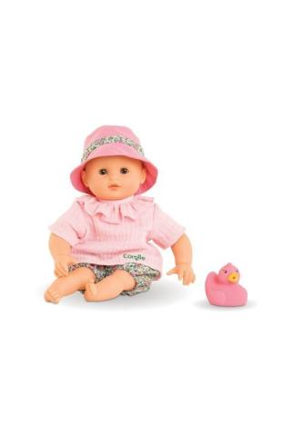 En avant moussaillons avec Bébé Bain Coralie, le compagnon parfait pour les jeux d'eau ! Ce petit poupon de 30 cm est conçu pour accompagner les enfants dans le bain, à la piscine ou à la mer. Son attache intégrée permet de le suspendre pour sécher après les éclaboussures. Avec son corps souple, son visage doux en vinyle délicatement parfumé à la vanille, et ses yeux marron dormeurs, il invite aux moments de tendresse. Habillé d’un T-shirt en gaze de coton avec une collerette, d’un bloomer fleuri et d’un bob assorti, Bébé Bain Coralie est accompagné d’un canard amusant qui crache de l’eau.