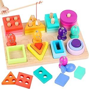 Montessori Toy for Ages 1 2 3 Years Old, Wooden Sorting and Stacking Jigsaw Puzzle Shape Sorted 3 in 1 Color Recognition Color Fishing Game Motor Skills Toy for Toddler Girl : Amazon.com.be: Toys