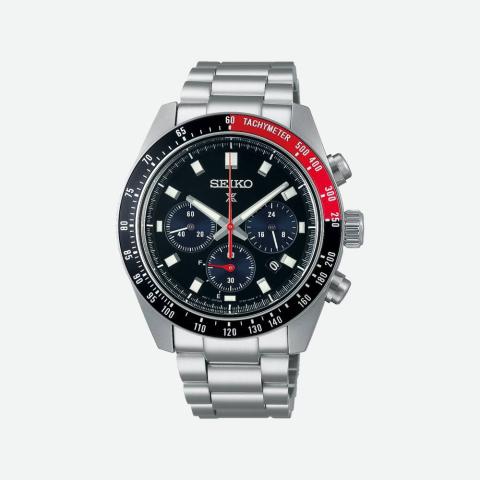 Montre Seiko Prospex Speedtimer SSC915P1 en acier inoxydable au cadran noir et rouge, mouvement à quartz solaire. Livraison offerte.