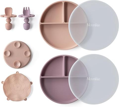 Moonkie 2 Pack Kids Silicone Plates with Lid, Baby Plates with Suction Cup, BPA Free, Non-Slip, Divided, with Forks and Spoons, Microwave and Safe : Amazon.fr: Baby Products