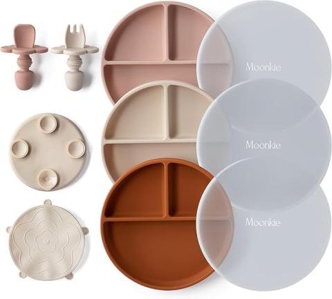 Moonkie Assiette Bébé Pied d'Aspiration, 3 Pièces Silicone Antidérapante, Cuillère et Fourchette, Sans BPA