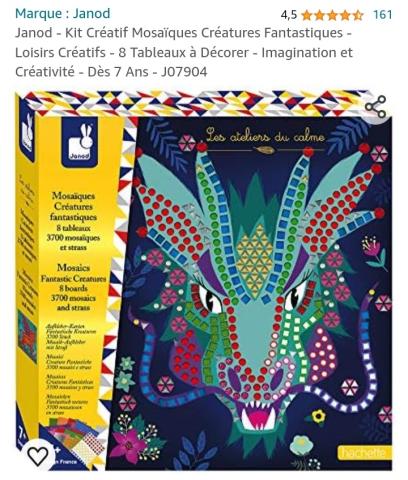 Ce produit est extrait d'une liste de cadeaux (Anniversaire, Noël, ...) déposée sur Kadolog. Kadolog permet de créer des listes de cadeaux (Anniversaire, Noël, ...) en toute liberté. Il est possible d'ajouter toutes vos envies cadeaux et de recevoir les dons directement sur votre compte. Avec les dons reçus, vous êtes alors libre d'aller acheter vos produits (comme ce 'Mosaïques créatures fantastiques ') où et quand vous le souhaitez.
