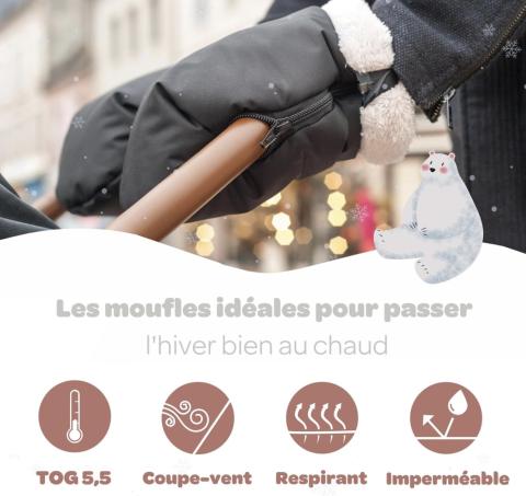 Moufles pour poussette! Système d'attaches par zip pour une fixation facile sur la poussette, Doublure chaude et confortable pour la pluie et la neige.