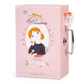 Op voorraad, voor 15.00 uur besteld, morgen in huis | Verzendkosten € 3,95Let op, deze koffertjes zijn verkleurd door het zonlicht en worden daarom met korting aangebodenPop in verkleedkoffertje, Les Parisiennes, Moulin RotyPrachtig garderobekoffertje met pop uit de serie 'Les Parisiennes' van Moulin Roty. In het koffertje vindt je een lieve pop gekleed in een mooi zwart jurkje met stipjes en in de garderobe hangen meerdere extra kledingstukken; een leuke gebloemde blouse, een roze lange broek, een pyjama setje, een tule rokje en een roze short.