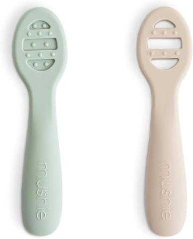Mushie Cuillère D'apprentissage en Silicone | Lot De 2 Cuillères Pour Tout-Petits| Pour Bébé Pour Apprendre à Manger Seul | Lavable au Lave-Vaisselle | Cambridge Blue/Shifting Sand : Amazon.com.be: Cuisine et maison