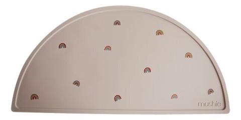 Protégez votre table ou la tablette repas de Bébé avec ce joli set de table orné d'arcs-en-ciel de Mushie. En silicone : imperméable et facile à nettoyer !