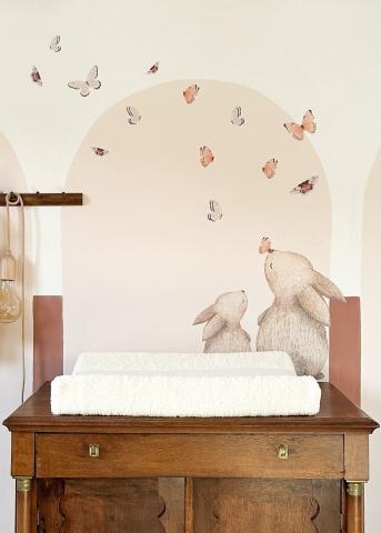 Lieve konijntjes set met de roze vlinders - een fijne aanvulling voor de babykamer of kinderkamer. De konijntjes zijn geïllustreerd door Marjolein van Appeloogje en de vlinders door Sabine van Papertales Design