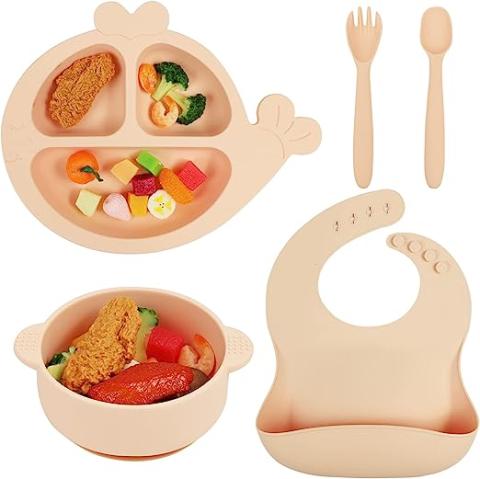 My Little Nursery Lot Vaisselle Antidérapente, Pack De 5 Pièces Beige Pour Bébé Avec Assiette "Baleine", Bol, Bavoir, Fourchette, Cuillère - Compatible Micro-ondes Et Lave Vaisselle - Sans BPA nV PVC : Amazon.fr: Bébé et Puériculture