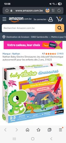 Ce produit est extrait d'une liste de cadeaux (Anniversaire, Noël, ...) déposée sur Kadolog. Kadolog permet de créer des listes de cadeaux (Anniversaire, Noël, ...) en toute liberté. Il est possible d'ajouter toutes vos envies cadeaux et de recevoir les dons directement sur votre compte. Avec les dons reçus, vous êtes alors libre d'aller acheter vos produits (comme ce 'Nathan Baby Electro Dinosaures-Jeu éducatif électronique autocorrectif pour les enfants dès 2 ans, 31623 : Amazon.com.be: Jouets ') où et quand vous le souhaitez.