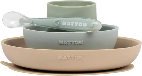 Nattou Set Repas en Silicone pour Enfants, 4 Pièces, 1 Cuillère, 1 Gobelet, 1 Assiette, 1 Bol, Antidérapant, Sans BPA, Silicone, Vert/Beige