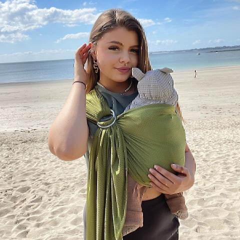 Lors des fortes chaleurs, portez votre bébé dans votre R'Sling Naturiou ! Parfaitement aérée grâce à son tissu en maille respirante.