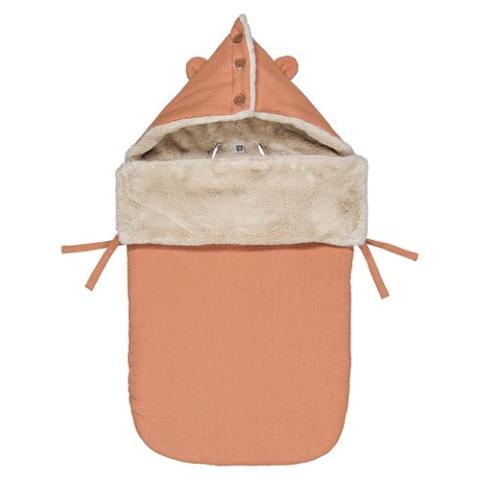 Plein hiver • Extérieur en gaze de coton, intérieur en tissu duveteux • Fermeture zippée • Capuche fixe boutonnée et rehaussée de petites oreilles