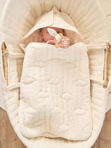 Idéal pour envelopper bébé lors des sorties, le nid d'ange possède des ouvertures sur le dos pour pouvoir y passer les sangles de la coque, de la poussette ou du siège-auto. Bébé bien au chaud, il est maintenant dans de bon