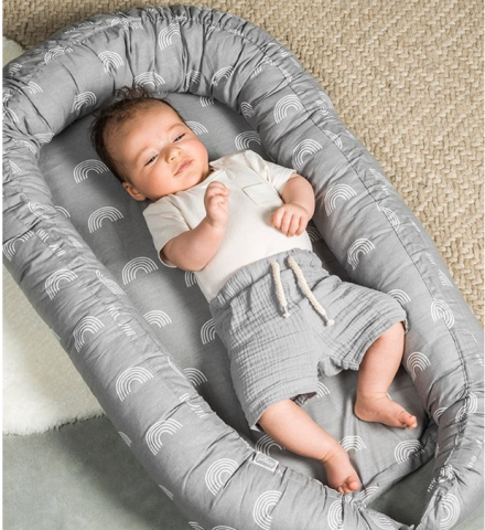 Délicat nid d'enfant de la collection Rainbow. Le bord rembourré vertical permet à votre bébé de se sentir en sécurité et l'empêche de rouler. Blottissez votre bébé dans ce nid sur le canapé ou dans le parc. Il est également très pratique à emporter lorsque vous sortez.