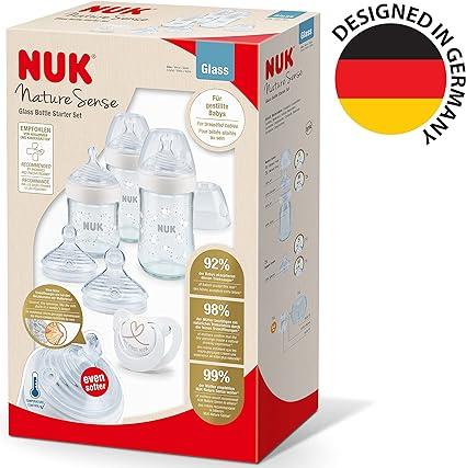 Nuk Nature Sense Coffret de biberons en verre, 0-6 mois, 3 biberons, 2 tétines, Sucette Genius, Blanc, 6 unités