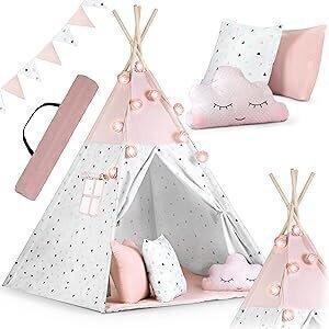 NUKIDO Ricokids NUKIDO Tipi pour enfant de style Montessori en coton et cadre en bois avec tapis isolant, 3 coussins, guirlande aérée, 120 x 120 x 165 cm, rose : Amazon.com.be: Jouets