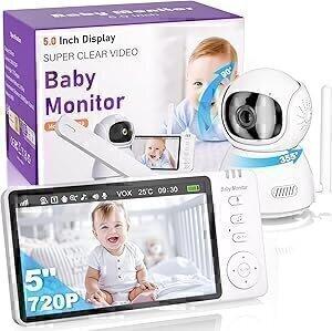 OBVHNUA Babyfoon Babyfoon 5 inch Babyfoon Video 720P HD IPS-scherm Babyfoon met Pan-Tilt 4X Zoom Video Opname Nachtzicht VOX Intercom 8 Slaapliedjes 5 Wekker Temperatuur Tijd : Amazon.com.be: Babyproducten