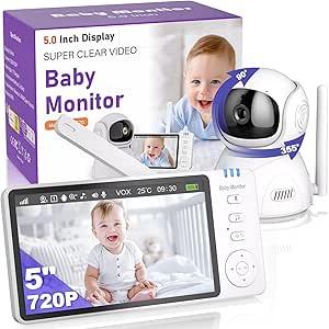 OBVHNUA Babyfoon van 5 inch met camera, 720p, basic, met babyfoon zonder wifi, zoom, nachtzicht, 360 graden kantelbaar, VOX intercom, 8 slaapliedjes, 5 alarmen : Amazon.com.be: Babyproducten