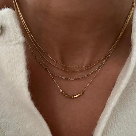 Collier JULIAN: Chaîne fine, détail serpentine torsadée, Longueur: 39+5cm ajustable Collier YASMINE: Chaîne fine, détail serpentine, Longueur: 41+5cm ajustable Collier GASTON: Chaîne fine maille, Longueur: 37+5cm ajustable Collier SERGIO: Chaîne fine maille, pampille bille dorée, Longueur: 37+5cm ajustable En acier ino