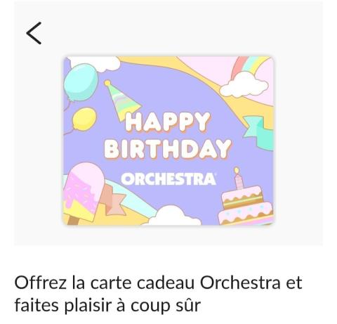 Ce produit est extrait d'une liste de cadeaux (Anniversaire, Noël, ...) déposée sur Kadolog. Kadolog permet de créer des listes de cadeaux (Anniversaire, Noël, ...) en toute liberté. Il est possible d'ajouter toutes vos envies cadeaux et de recevoir les dons directement sur votre compte. Avec les dons reçus, vous êtes alors libre d'aller acheter vos produits (comme ce 'Offrez la carte cadeau Orchestra et faites plaisir à coup sûr ') où et quand vous le souhaitez.