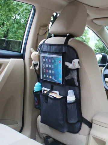 Les poches filets permettront d'y passer un biberon et le doudou. La tablette pourra aussi se glisser dans le revêtement transparent prévu à son effet.