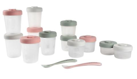 Set de 12 portions clips et 2 cuillères silicone Béaba : pack premier repas composé de 6 portions clip de 250 ml, 4 portions de 150ml, de 2 portions de 90ml et de 2 cuillères en silicone, tout le nécessaire pour démarrer la diversification alimentaire de vos tout-petits.