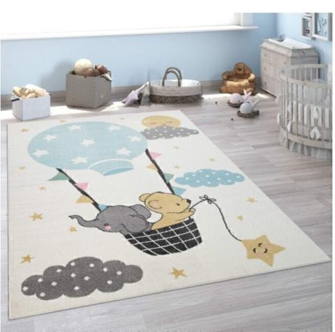 Tapis pour chambre enfant (Éléphant, Ours, Montgolfière, Lune, Beige)