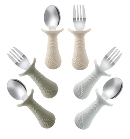 PandaEar Ensemble de Couverts pour Bébé, 6 Pièces Cuillères et Fourchettes en Silicone et Acier Inoxydable pour Bébés et Tout-Petits, sans BPA avec Design Antichoc en Silicone (Beige & Noyer & Gris)