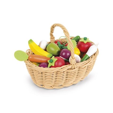 Panier en osier avec 24 fruits et légumes en bois pour compléter une dinette ou une cuisine de chez Janod