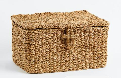 Panier de rangement en jonc de mer. Modèle de forme rectangulaire avec couvercle. Hauteur 20 cm. Largeur 24 cm. Longueur 35 cm.