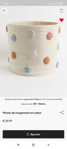 Ce produit est extrait d'une liste de cadeaux (Anniversaire, Noël, ...) déposée sur Kadolog. Kadolog permet de créer des listes de cadeaux (Anniversaire, Noël, ...) en toute liberté. Il est possible d'ajouter toutes vos envies cadeaux et de recevoir les dons directement sur votre compte. Avec les dons reçus, vous êtes alors libre d'aller acheter vos produits (comme ce 'Panier de rangement en coton - HOME | H&M BE ') où et quand vous le souhaitez.