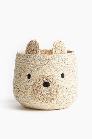 Panier de rangement en jute. Modèle représentant une adorable tête d'ours avec oreilles appliquées et éléments de visage brodés.