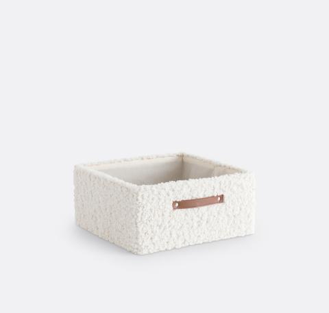 Zacht, functioneel en opvouwbaar. De Boklio opbergmand afgewerkt in bouclette siert de kamer met tederheid. Perfect voor het opbergen van uw lingerie of dagelijkse accessoires.Omschrijving • Bekleding buitenkant 100% polyester, bouclette afwerking • Effen non-woven binnenkant 100% polyester • Structuur in karton • 1 handgreep in polyurethaanOnderhoud • Alleen schoonmaken met een droge doekAfmetingen • Breedte : 31 cm • Hoogte : 15 cm • Diepte : 31 cm