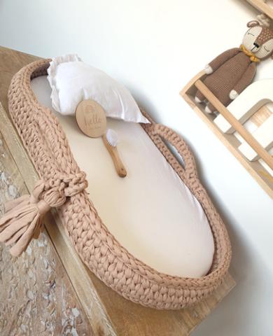 Adorable pour les soins de bébé. Le panier à langer est entièrement crocheter à la main à partir de coton peigné. Avec deux poignées en corde, facile de le transporter d'une pièce à l'autre. Lorsque plus besoin de l'utiliser comme matelas à langer par la suite, possibilité de l'utiliser comme panier pour repasser, pour ranger les jouets ou en corbeille à glisser sous le lit.