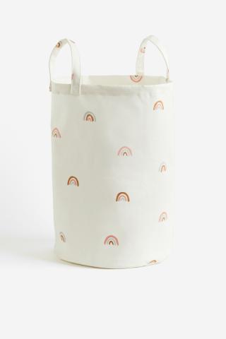 Panier de rangement en twill de coton à motif. Modèle avec deux poignées en haut. Intérieur facile à nettoyer à l’aide d’un chiffon humide. Diamètre 34 cm. Hauteur 52 cm.