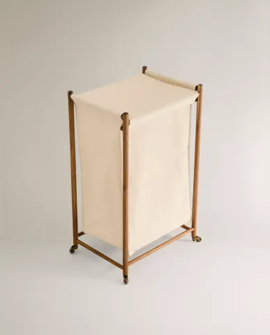 Panier à linge avec structure en bois et panier en coton, avec couvercle et roulettes qui facilitent sa mobilité et son utilisation.