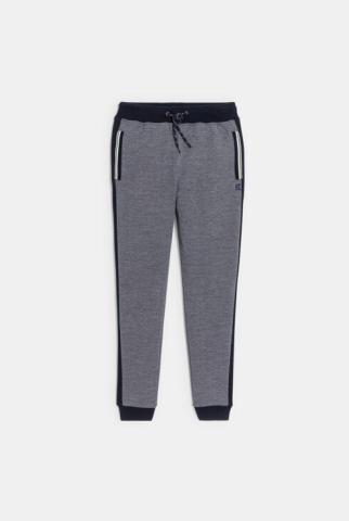 Pantalon garçon / Jogging. Pantalon de sport. Coupe jogging avec bas de jambe côtelés. Molleton de coton piqué. Taille côtelée-élastiquée avec cordon coulissant à nouer devant. 2 poches. 1 fausse poche dos. Bandes unies sur les côtés. Logo Okaïdi en détail. Coutures ton sur ton.