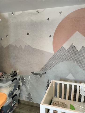Nous avions à cœur de décorer la chambre de Margo avec un joli papier peint. Nous avons craqué pour la version panoramique montagne de chez Leroy Merlin