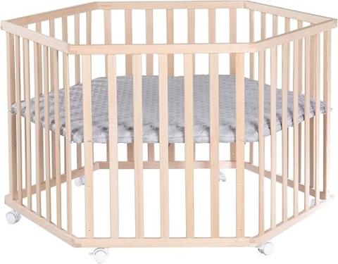 roba Parc Bébé Hexagonal en Bois Massif Bio Cosplay + Tapis de Parc roba Style Gris - Hauteur Ajustable sur 3 Niveaux - Roulettes avec Freins - Finition Naturelle