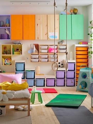 Une grande partie de la cave de la maison (chauffée) va être aménagée en grande salle de jeux pour les enfants. Nous avons besoin d’armoires, étagères, tapis, bibliothèque, chaises, canapé … pour aménager cet espace. Voici notre inspiration en photo, une salle de jeux haute en couleurs pour des heures d’amusement !
