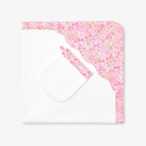 Cadeau de naissance à offrir à de futurs parents, la sortie de bain dévoile tout son chic. En coton éponge et complétée d'un gant, capuche festonnée et contour en tissu Liberty subliment ce duo doux et réconfortant parfait pour sécher et réchauffer bébé dès la sortie de l'eau.