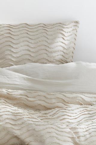 Parure de couette lit simple en tissu de coton doux avec motif tufté dessinant des vagues. Housse fermée par boutons-pression dissimulés à la base. Une taie d'oreiller à rabat portefeuille. Densité 57 fils/cm².