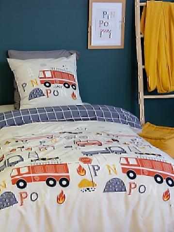 Pour les mini sapeurs pompiers !- Parure de lit 140 x 200 cm - En coton 57 fils - 1 housse de couette - 1 taie d'oreiller 63 x 63 cm - Imprimé 'pompier' all over - Fermeture par boutonnière dissimulée