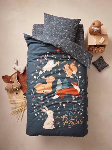 Transformez son petit nid douillet en véritable refuge au coeur de la forêt. Une parure housse de couette + taie d'oreiller qui invite les enfants pour une balade à Brocéliande entre imprimés fleuris, animaliers et