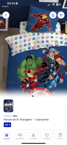 en toute liberté. Il est possible d'ajouter toutes vos envies cadeaux et de recevoir les dons directement sur votre compte. Avec les dons reçus, vous êtes alors libre d'aller acheter vos produits (comme ce 'Parure lit Marvel