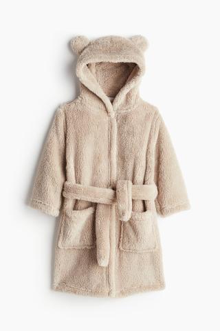 Peignoir en tissu polaire doux. Modèle à manches longues avec capuche à oreilles, ceinture à nouer à la taille et poches devant.